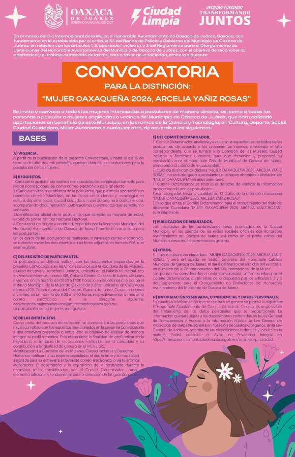 Oaxaca de Juárez, Oax. 10 de febrero de 2026.- En el marco de la conmemoración del Día Internacional de la Mujer, el Honorable Ayuntamiento de Oaxaca de Juárez emitió la convocatoria para la distinción ciudadana “Mujer Oaxaqueña 2026, Arcelia Yañiz Rosas”, con el objetivo de reconocer la trayectoria, el esfuerzo y las contribuciones relevantes de mujeres originarias o vecinas del municipio en beneficio de la sociedad.