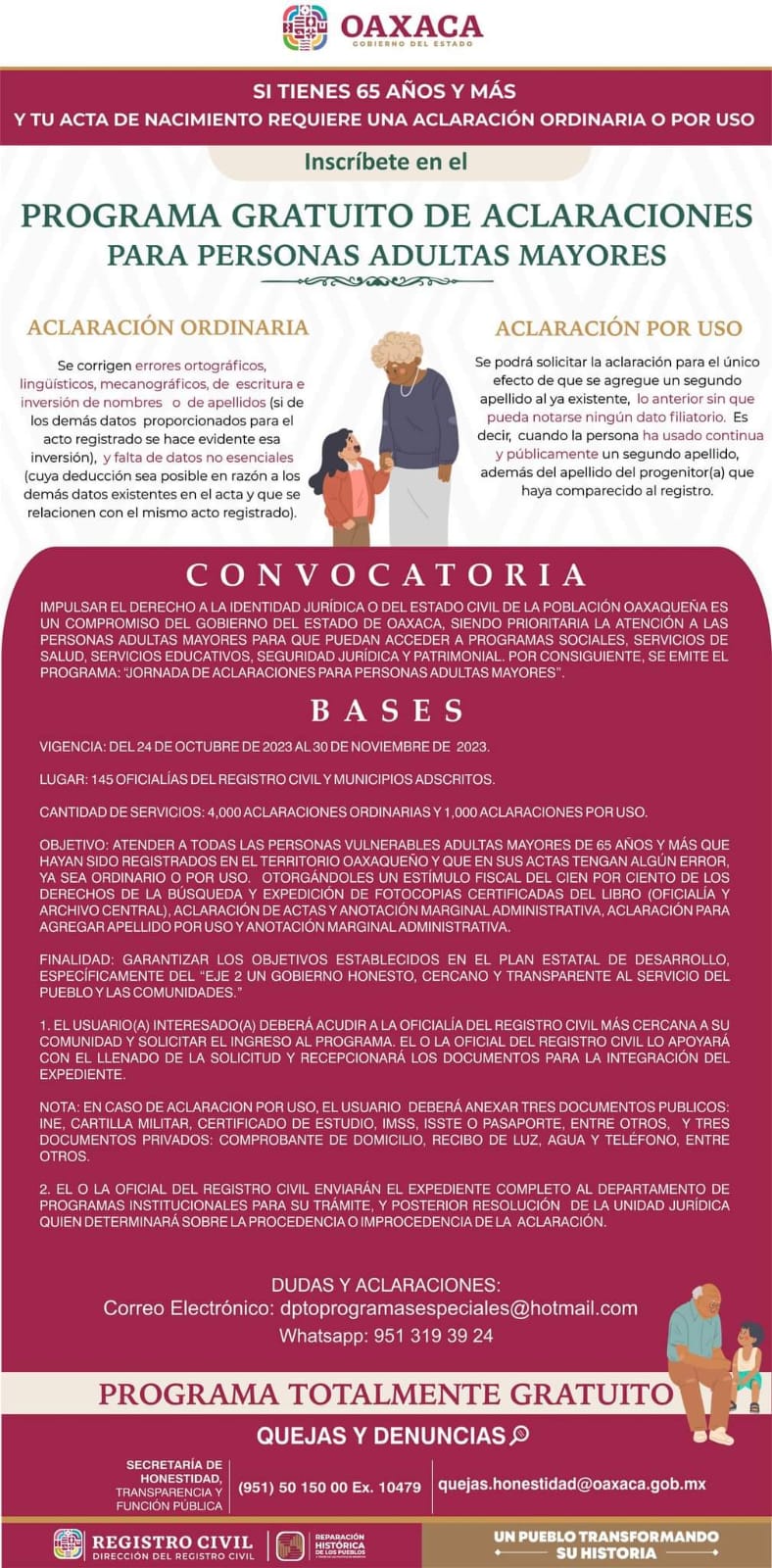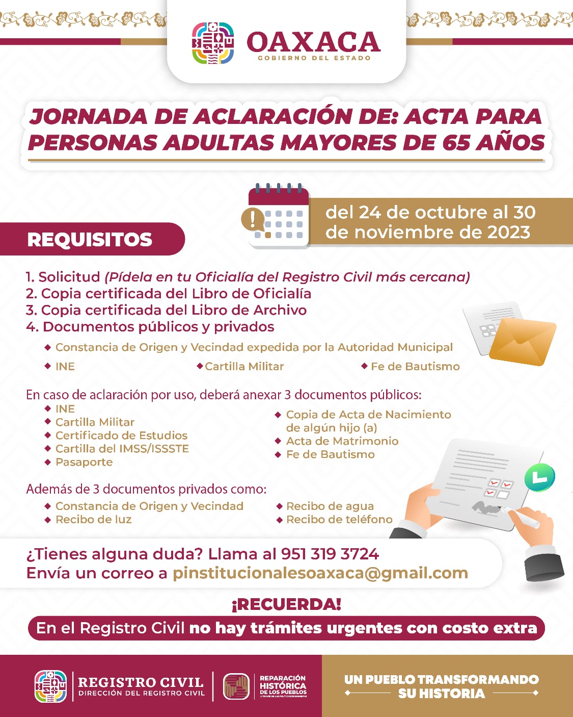 Oaxaca de Juárez, Oax. 16 de noviembre de 2023. La Dirección del Registro Civil de Oaxaca continúa con la Jornada de Aclaración de Acta de Nacimiento gratuita para personas mayores de 65 años, la cual inició el 24 de octubre y concluirá este 30 de noviembre.