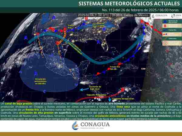 Oaxaca de Juárez, Oax. 26 de febrero de 2025.- La Coordinación Estatal de Protección Civil y Gestión de Riesgos (CEPCyGR) informa que, para este miércoles, la circulación anticiclónica en niveles medios de la troposfera se moverá hacia el oriente y centro de la República Mexicana, por lo que este día continuará el cielo poco nuboso o despejado y ambiente caluroso a muy caluroso en las regiones Costa, Istmo de Tehuantepec y Sierra Sur.