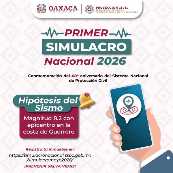 Oaxaca de Juárez, Oax. 13 de abril de 2026.- Con el objetivo de fomentar la cultura de la prevención y fortalecer las capacidades de respuesta ante situaciones de emergencia o desastre, la Coordinación Estatal de Protección Civil y Gestión de Riesgos (CEPCyGR) informó que el miércoles 6 de mayo, a las 11:00 horas, se realizará el Primer Simulacro Nacional 2026.