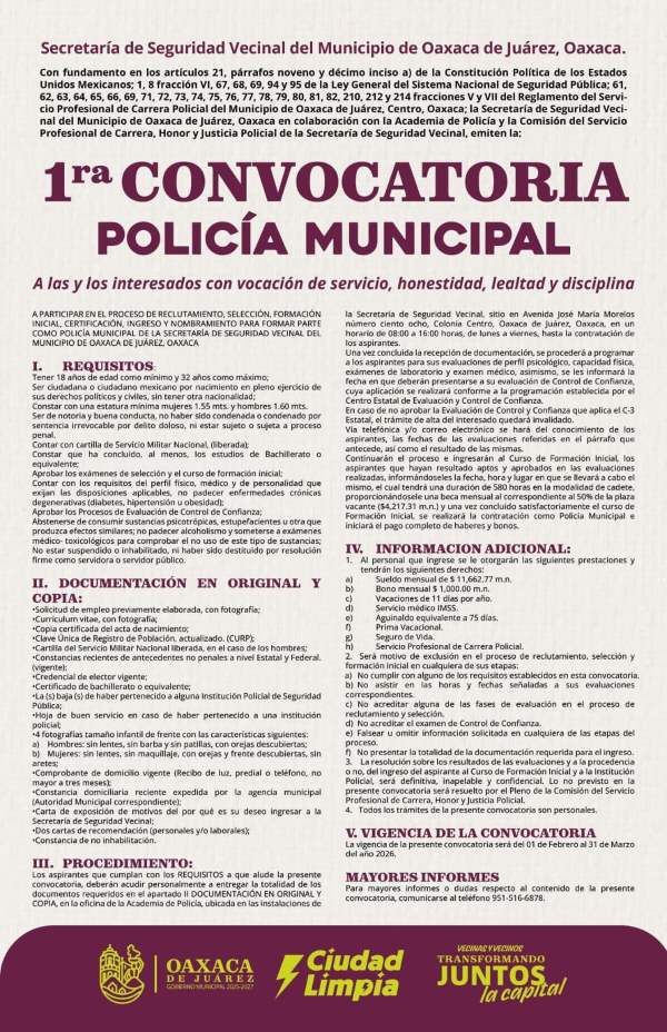 Oaxaca de Juárez, Oax. 12 de febrero de 2026.- Con el objetivo de fortalecer una corporación cercana a la ciudadanía y consolidar una ciudad más segura, el Ayuntamiento de Oaxaca de Juárez, a través de la Secretaría de Seguridad Vecinal, emitió la Primera Convocatoria para ingresar a la Policía Municipal.