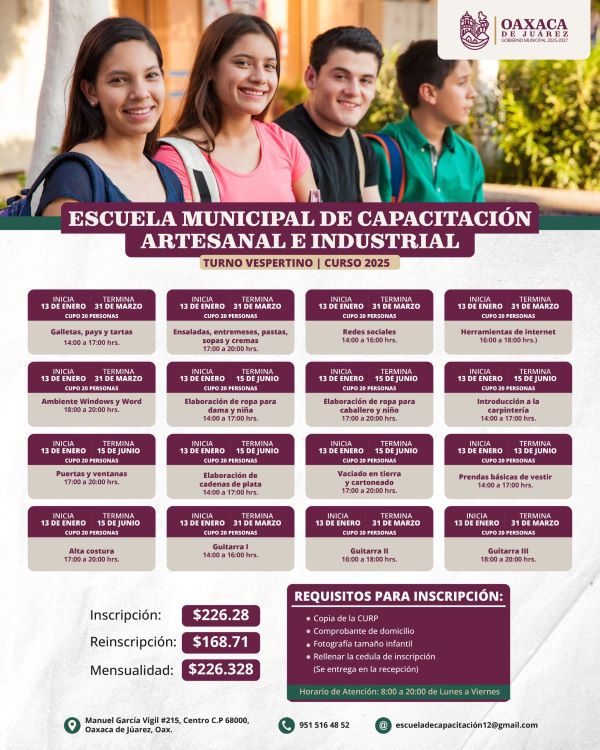 Para consultar los horarios y requisitos, pueden comunicarse al número telefónico 951 516 4852 o inscribirse en las instalaciones ubicadas en Manuel García Vigil 215, en Oaxaca de Juárez, de lunes a viernes, de 8:00 a 20:00 horas.