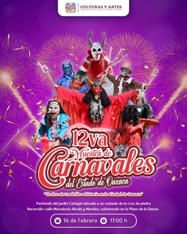 Oaxaca de Juárez, Oax. 12 de febrero de 2026.- La Secretaría de las Culturas y Artes (Seculta) invita a participar en la 12° Muestra de Carnavales del Estado de Oaxaca, una celebración que impulsa la preservación, difusión y revitalización de estas actividades comunitarias.