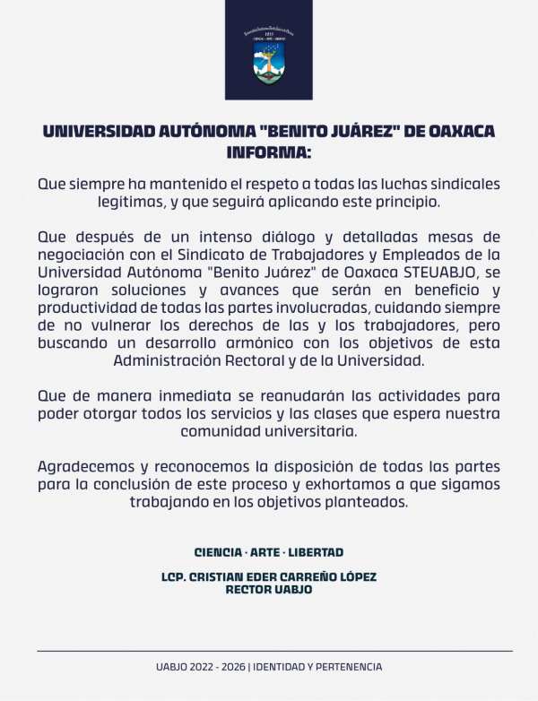 Que después de un intenso diálogo y detalladas mesas de negociación con el Sindicato de Trabajadores y Empleados de la Universidad Autónoma «Benito Juárez» de Oaxaca STEUABJO, se lograron soluciones y avances que serán en beneficio y productividad de todas las partes involucradas, cuidando siempre de no vulnerar los derechos de las y los trabajadores, pero buscando un desarrollo armónico con los objetivos de esta Administración Rectoral y de la Universidad.