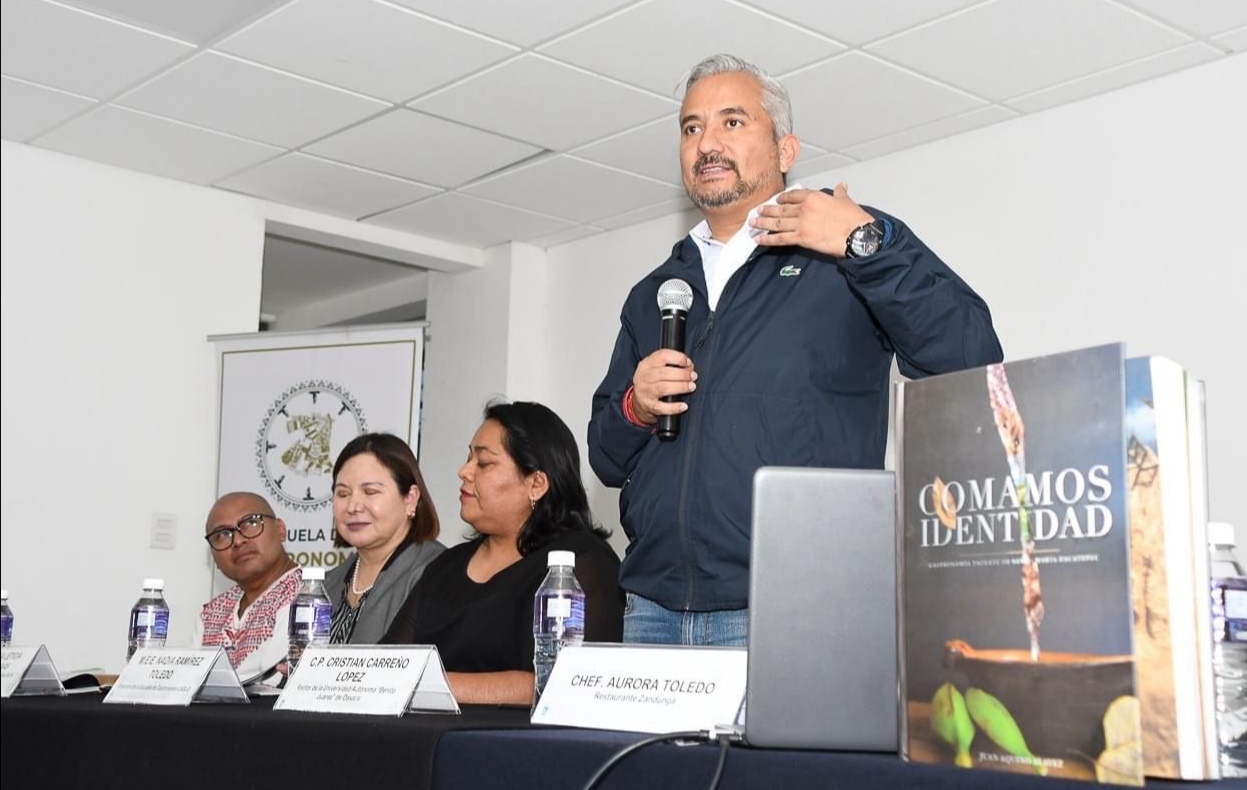 Oaxaca, Oax. 22 de noviembre de 2023.-Como parte de las actividades de formación continua que impulsa la Escuela de Gastronomía de la Universidad Autónoma “Benito Juárez” de Oaxaca (UABJO), se realizó la presentación del libro “Comamos identidad. Gastronomía Tacuate de Santa María Zacatepec”, de la autoría del Chef Juan Aquino Alavez.