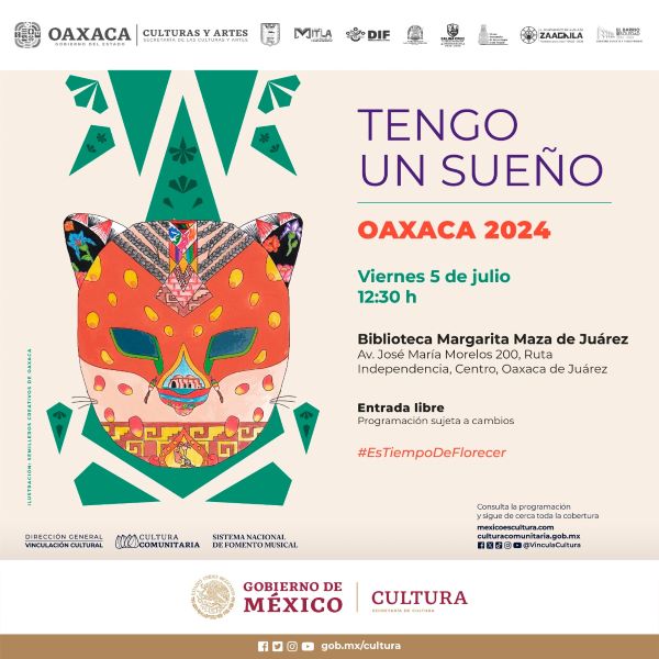 Oaxaca de Juárez, Oax. 3 de julio de 2024.- El próximo 5 de julio, se realizarán las actividades alusivas al festival Tengo un Sueño 2024 “Herencia viva en Oaxaca”, uno de los 27 eventos estatales y biestatales en el país impulsados por la Secretaría de Cultura del Gobierno de México, a través del programa Cultura Comunitaria.