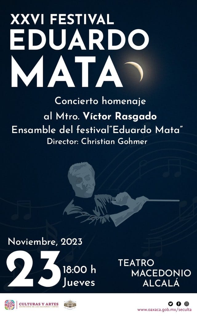 Además, el público podrá disfrutar del Concierto-Homenaje a Víctor Rasgado, con obras de música de cámara interpretadas por el ensamble del Festival Eduardo Mata, integrado por mujeres y hombres músicos locales e invitados, especialistas en la ejecución de la música de concierto, dicha actividad se realizará en el Teatro Macedonio Alcalá este 23 de noviembre, a las 18:00 horas.