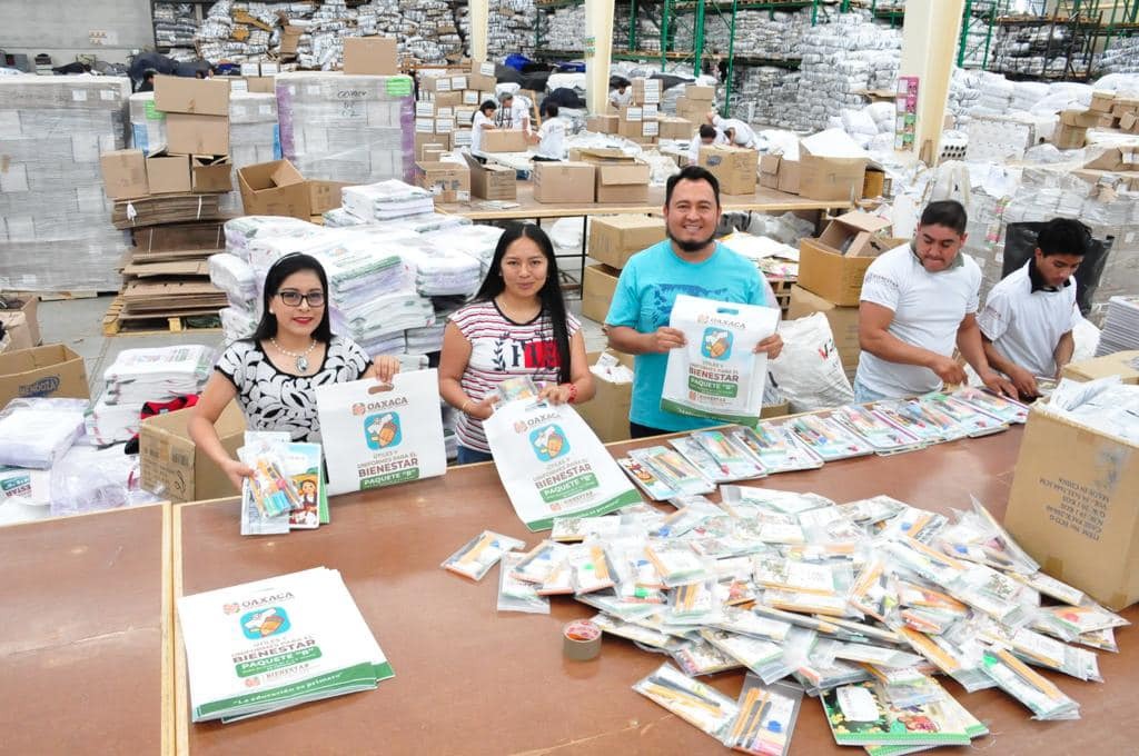 En la coordinación de acciones, el director general del IEEPO, Emilio Montero Pérez acompañó a la encargada de Despacho de la Secretaría de Bienestar, Tequio e Inclusión, Mónica Belem López y a la directora del Programa de Dotación y Útiles Escolares en la entidad, Citlalli Carazo Ríos, a una supervisión de la preparación de los paquetes en las instalaciones del almacén donde se encuentran resguardados.