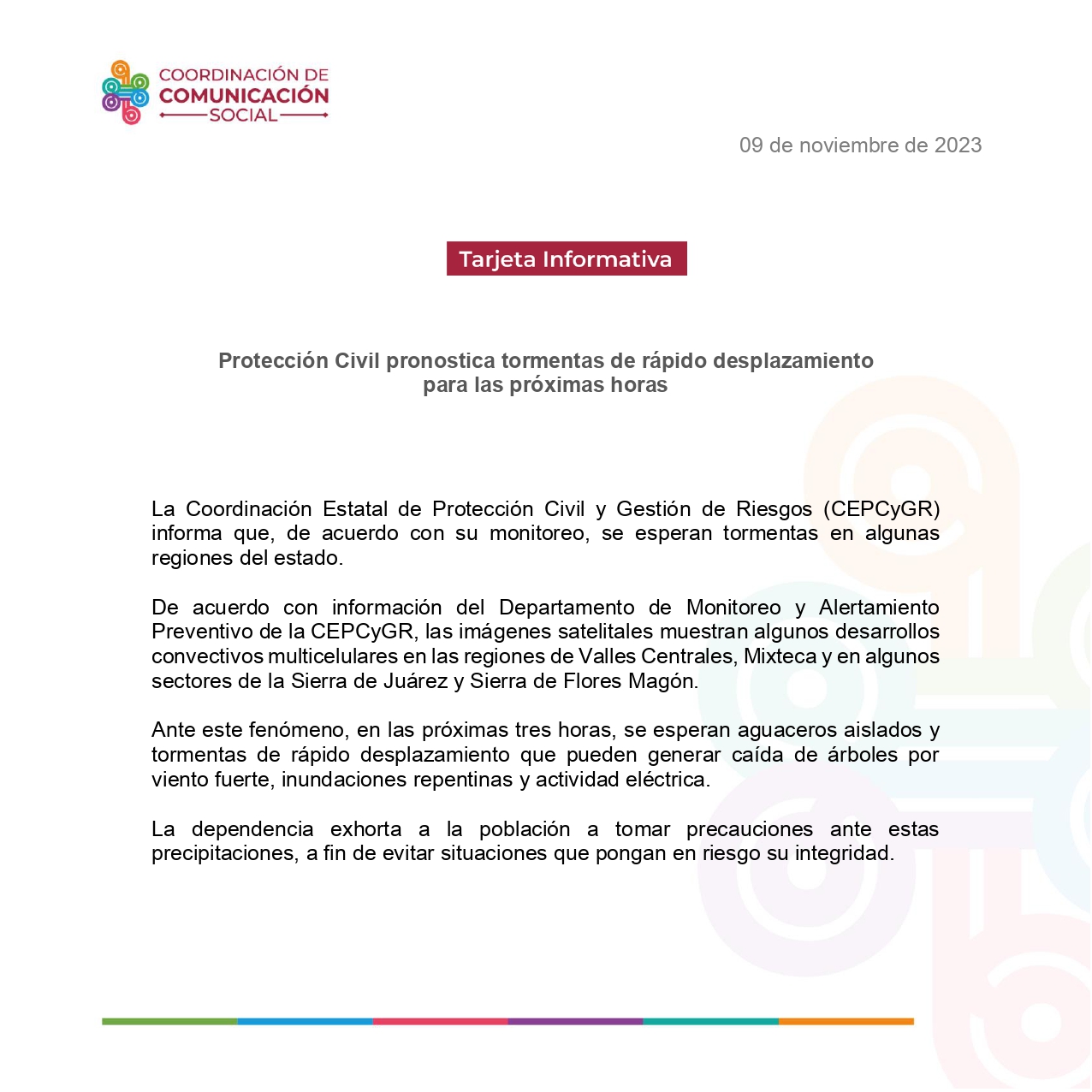 Tarjeta informativa Protección Civil pronostica tormentas de rápido desplazamiento en las próximas horas by Editor 9 noviembre, 2023 OAXACA0 Comparte en tus redes sociales Tweet Comparte en tus redes sociales Tweet Editor